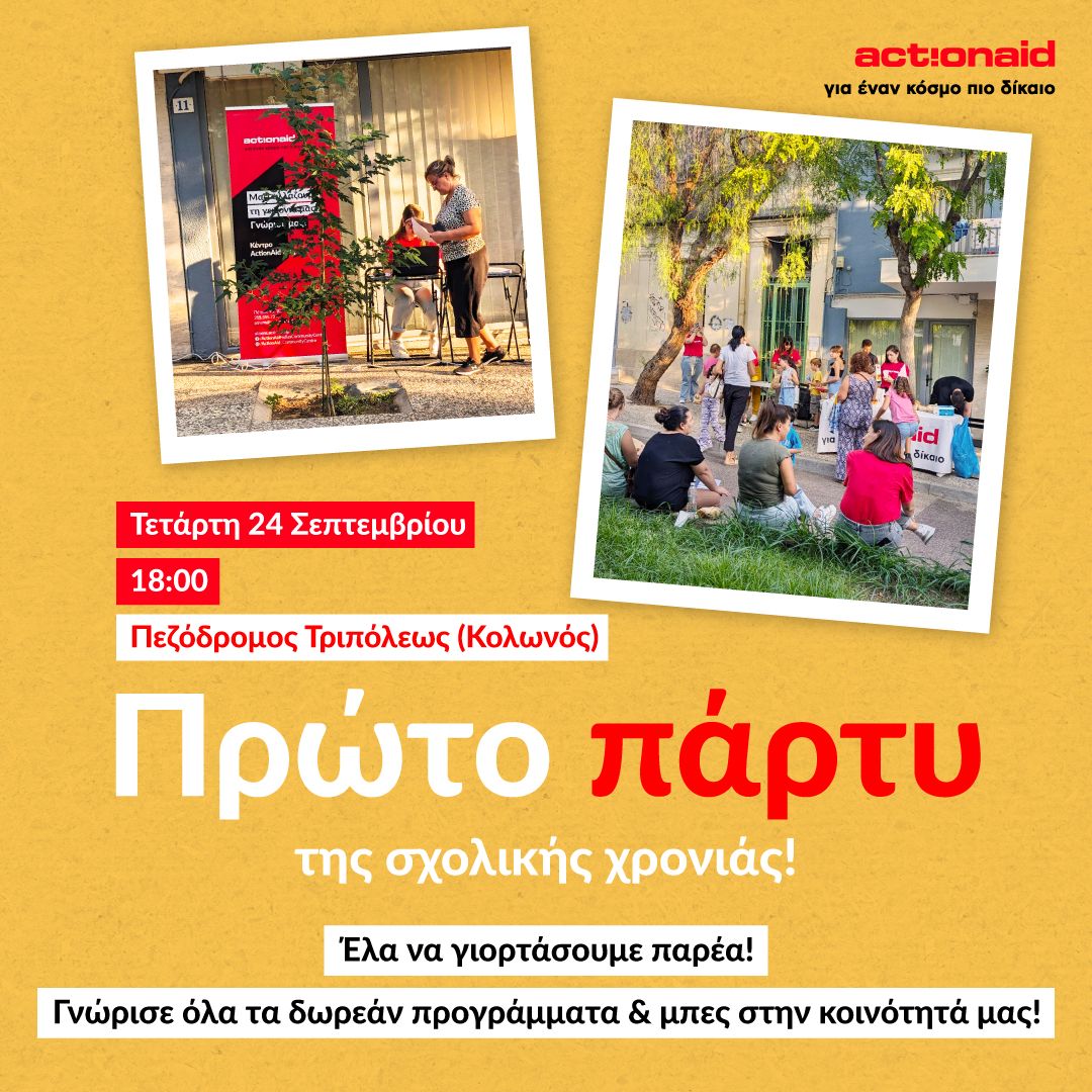 Στις 24 Σεπτεμβρίου στις 18:00 ξεκινάμε τη νέα σχολική χρονιά με τον πιο όμορφο τρόπο: με μια μεγάλη γιορτή στον πεζόδρομο της Τριπόλεως, απέναντι από το Κέντρο μας στην Αθήνα.